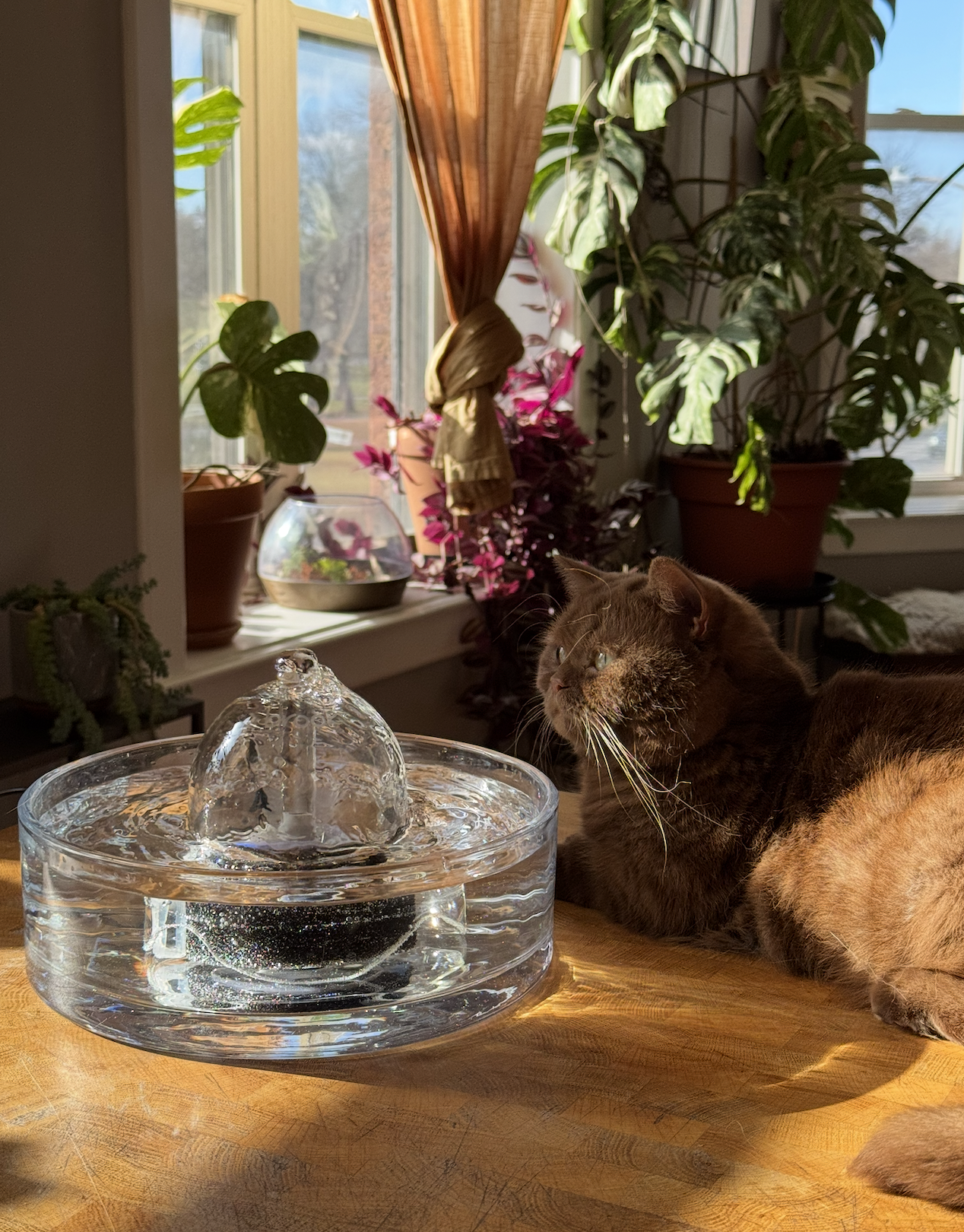 ❣️ Why we love it: it’s fully glass, aesthetically pleasing, easy to clean, & keeps our water filtered, fresh, and flowing all day.